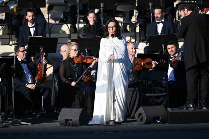 Nana Mouskouri - Passation de la flamme olympique de la Grèce à la France austade panathénaïque d'Athènes, Grèce, le 26 avril 2024. © Nikos Zagas/Bestimage Passing of the Olympic flame from Greece to France at the Panathenaic Stadium in Athens, Greece, on April 26, 2024.