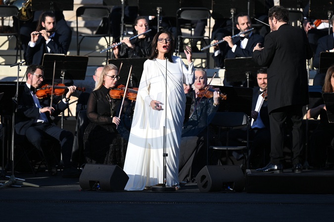 Nana Mouskouri - Passation de la flamme olympique de la Grèce à la France austade panathénaïque d'Athènes, Grèce, le 26 avril 2024. © Nikos Zagas/Bestimage Passing of the Olympic flame from Greece to France at the Panathenaic Stadium in Athens, Greece, on April 26, 2024.