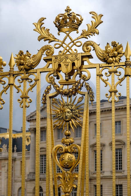 gold guilded ornate metal work on fence at Palace of Versailles / Château de Versailles.Versailles. Paris. France. EU. 25 April 2024., Credit:Mark Fairhurst / Avalon