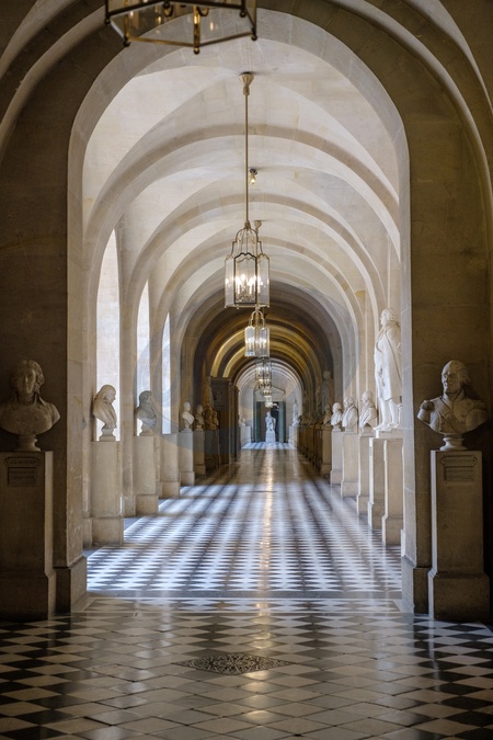 Corridor and busts in the Palace of Versailles / Château de Versailles.Versailles. Paris. France. EU. 25 April 2024., Credit:Mark Fairhurst / Avalon