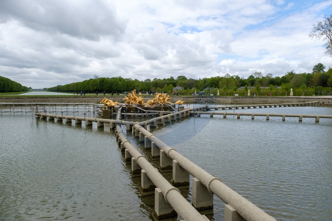 Gardens and fountains of the Palace of Versailles / Château de Versailles.Exposed pipes show how the fountains are supplied with water.Versailles. Paris. France. EU. 25 April 2024., Credit:Mark Fairhurst / Avalon
