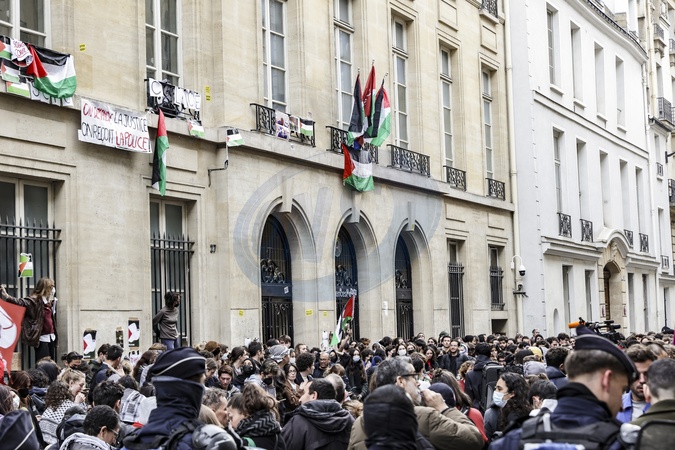 Illustrations de l'occupation de l'établissement Sciences Po à Paris par des étudiants pro-palestiniens