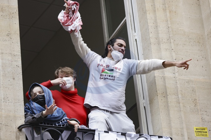 Illustrations de l'occupation de l'établissement Sciences Po à Paris par des étudiants pro-palestiniens