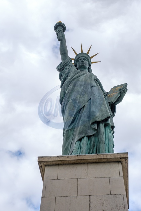 Replica of the Statue of Liberty standing nearly 38 feet on a River Seine island, unveiled in 1889. Pont de GrenelleParis. France. EU. 25 April 2024., Credit:Mark Fairhurst / Avalon