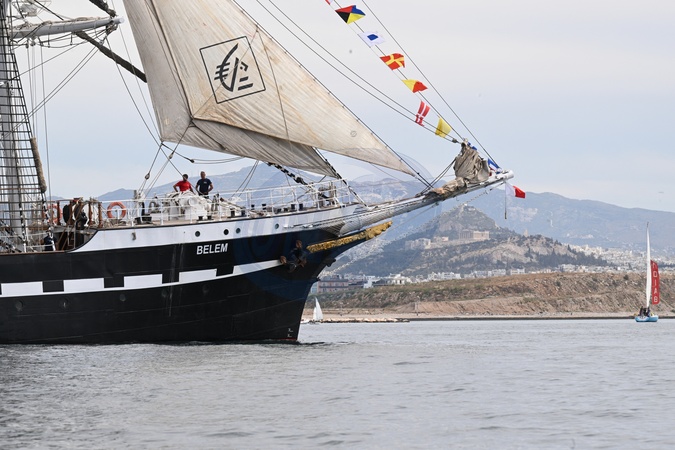 Ostatni trójmasztowy francuski żaglowiec Belem opuszcza port w Pireusie niedaleko Aten z ogniem olimpijskim na pokładzie i wyrusza w podróż do Francji