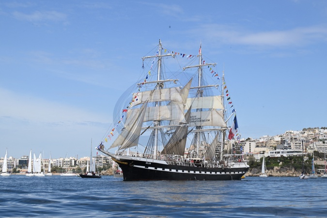Ostatni trójmasztowy francuski żaglowiec Belem opuszcza port w Pireusie niedaleko Aten z ogniem olimpijskim na pokładzie i wyrusza w podróż do Francji
