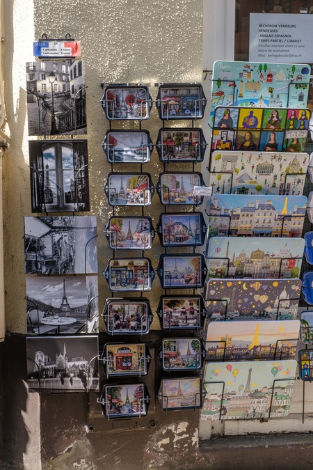 Souvenirs and cards outside shops in Montmartre near Sacre Coeur. Paris. France. EU. 25 April 2024., Credit:Mark Fairhurst / Avalon