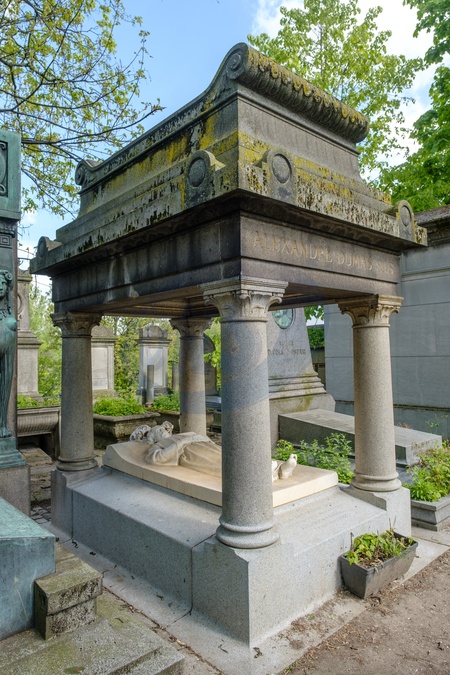 Cimetiere de Montmartre. Montmarte cemetery.The main graveyard for the distict lie beneath a busy road. Containg many old and impressive tombs, including those of Berlioz, Offenbach,Stendhal, Dumas and Russian dancer Nijinsky.seen here is the tomb of Alexandre Dumas. Playwright and novelistParis. France. EU. 25 April 2024., Credit:Mark Fairhurst / Avalon