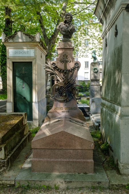 Cimetiere de Montmartre. Montmarte cemetery.The main graveyard for the distict lie beneath a busy road. Containg many old and impressive tombs, including those of Berlioz, Offenbach,Stendhal, Dumas and Russian dancer Nijinsky.seen here is Jaques Offenbach's tomb.Paris. France. EU. 25 April 2024., Credit:Mark Fairhurst / Avalon