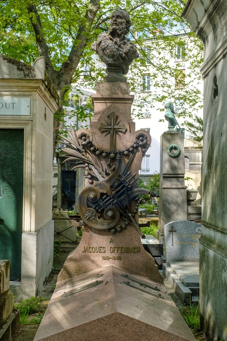 Cimetiere de Montmartre. Montmarte cemetery.The main graveyard for the distict lie beneath a busy road. Containg many old and impressive tombs, including those of Berlioz, Offenbach,Stendhal, Dumas and Russian dancer Nijinsky.seen here is Jaques Offenbach's tomb.Paris. France. EU. 25 April 2024., Credit:Mark Fairhurst / Avalon