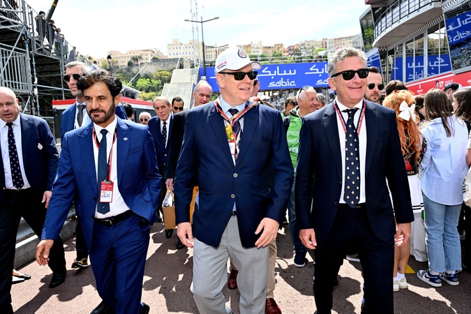 Mohammed Ben Sulayem, le président de la FIA, le prince Albert II de Monaco et Alejandro Agag, fondateur et président de Formula E, - Le prince Albert II de Monaco, la princesse Charlene et leurs enfants la princesse Gabriella et le prince héréditaire Jacques ont assisté au Monaco E-Prix 2024, le 27 avril 2024. Le pilote Jaguar Mitch Evans a remporté la course devant son coéquipier Nick Cassidy suivi par Stoffel Vandoorne sur DS Penske. C'est la 7eme édition du Monaco E-prix. A l'occasion de la 10eme saison du Championnat du Monde ABB FIA Formula E, les monoplaces de 3eme génération ont parcouru les rues de la Principauté. © Bruno Bebert/Bestimage Princess and Prince of Monaco during the Monaco E-Prix, round 8 of the 2024 FIA Formula E World Championship at Circuit de Monaco on April 27, 2024 in Monte Carlo, Monaco.