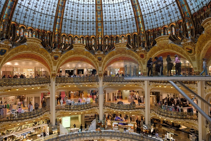Galeries Lafayette shopping centre.Grand, century-old department store with a steel-frame art nouveau glass dome ringed by loggias.Paris. France. EU. 25 April 2024., Credit:Mark Fairhurst / Avalon