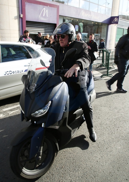 Info - Gérard Depardieu placé en garde à vue pour agressions sexuelles - Exclusif - Gérard Depardieu quitte la station de radio RTL en scooter à Paris le 7 mars 2019. Exclusive - For Germany call for price - French actor Gérard Depardieu leaves the radio station RTL by scooter in Paris on March 7th, 2019.