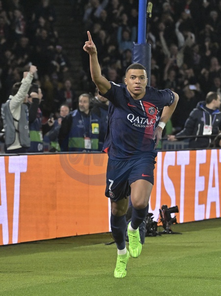 Info - Le PSG, champion de France pour la 12ème fois de son histoire - MBappe Kylian (Psg) but et joie - Match aller des huitièmes de finale de la Ligue des champions entre le PSG et la Real Sociedad (2-0) au Parc des Princes à Paris le 14 février 2024. © Federic Pestellini / Panoramic / Bestimage