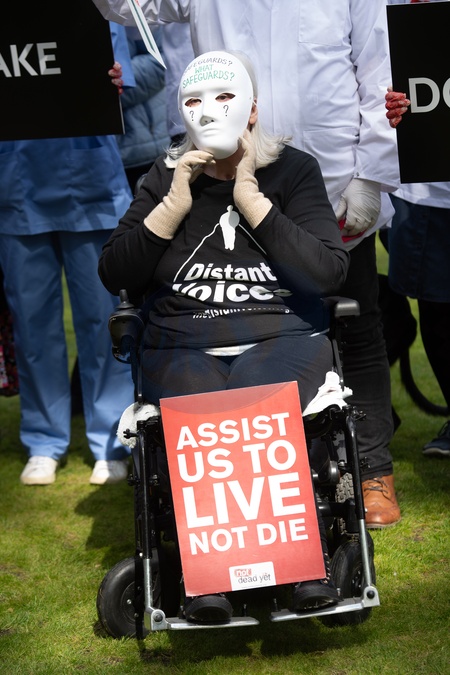 Campaigners from Care Not Killing, Christian Concern and disability groups Not Dead Yet and Distant Voices take part in a protest opposing change to the laws regarding assisted dying at Old Palace Yard, London, England, UK on Monday 29 April, 2024. A debate on assisted dying is tabled in Parliament today. Currently assisted suicide is banned in England, Wales and Northern Ireland, with a maximum prison sentence of 14 years., Credit:Justin Ng / Avalon