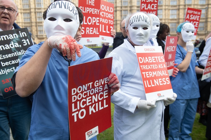 Campaigners from Care Not Killing, Christian Concern and disability groups Not Dead Yet and Distant Voices take part in a protest opposing change to the laws regarding assisted dying at Old Palace Yard, London, England, UK on Monday 29 April, 2024. A debate on assisted dying is tabled in Parliament today. Currently assisted suicide is banned in England, Wales and Northern Ireland, with a maximum prison sentence of 14 years., Credit:Justin Ng / Avalon