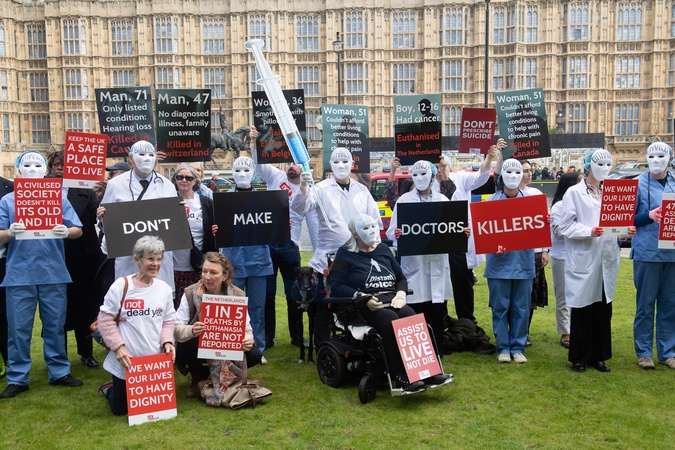 Campaigners from Care Not Killing, Christian Concern and disability groups Not Dead Yet and Distant Voices take part in a protest opposing change to the laws regarding assisted dying at Old Palace Yard, London, England, UK on Monday 29 April, 2024. A debate on assisted dying is tabled in Parliament today. Currently assisted suicide is banned in England, Wales and Northern Ireland, with a maximum prison sentence of 14 years., Credit:Justin Ng / Avalon