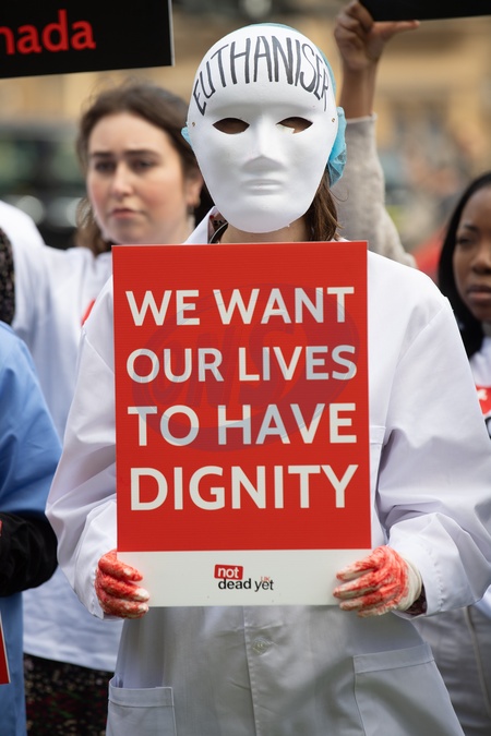 Campaigners from Care Not Killing, Christian Concern and disability groups Not Dead Yet and Distant Voices take part in a protest opposing change to the laws regarding assisted dying at Old Palace Yard, London, England, UK on Monday 29 April, 2024. A debate on assisted dying is tabled in Parliament today. Currently assisted suicide is banned in England, Wales and Northern Ireland, with a maximum prison sentence of 14 years., Credit:Justin Ng / Avalon