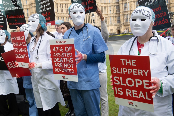 Campaigners from Care Not Killing, Christian Concern and disability groups Not Dead Yet and Distant Voices take part in a protest opposing change to the laws regarding assisted dying at Old Palace Yard, London, England, UK on Monday 29 April, 2024. A debate on assisted dying is tabled in Parliament today. Currently assisted suicide is banned in England, Wales and Northern Ireland, with a maximum prison sentence of 14 years., Credit:Justin Ng / Avalon