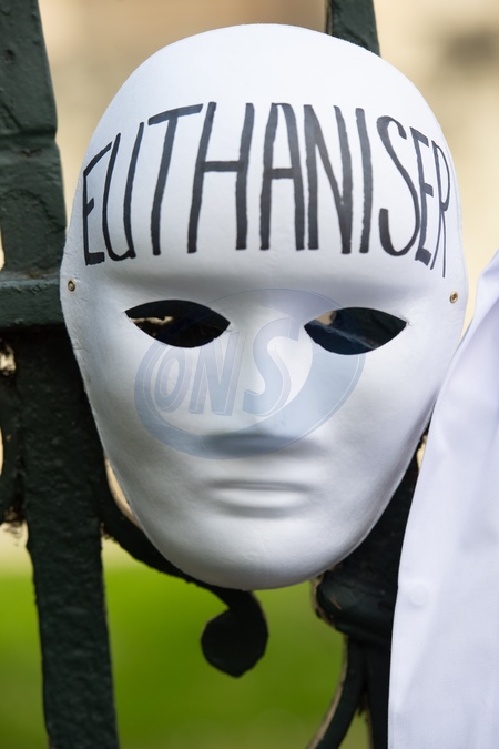 Campaigners from Care Not Killing, Christian Concern and disability groups Not Dead Yet and Distant Voices take part in a protest opposing change to the laws regarding assisted dying at Old Palace Yard, London, England, UK on Monday 29 April, 2024. A debate on assisted dying is tabled in Parliament today. Currently assisted suicide is banned in England, Wales and Northern Ireland, with a maximum prison sentence of 14 years., Credit:Justin Ng / Avalon