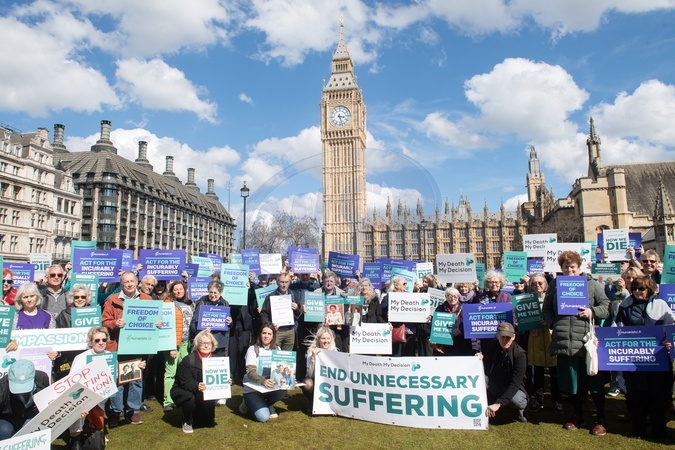 Campaigners from Pro-change campaign group Humanists UK take part in a protest calling for change to the laws regarding assisted dying at Parliament Square, London, England, UK on Monday 29 April, 2024. A debate on assisted dying is tabled in Parliament today. Currently assisted suicide is banned in England, Wales and Northern Ireland, with a maximum prison sentence of 14 years., Credit:Justin Ng / Avalon