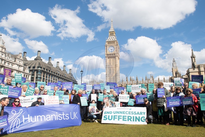 Campaigners from Pro-change campaign group Humanists UK take part in a protest calling for change to the laws regarding assisted dying at Parliament Square, London, England, UK on Monday 29 April, 2024. A debate on assisted dying is tabled in Parliament today. Currently assisted suicide is banned in England, Wales and Northern Ireland, with a maximum prison sentence of 14 years., Credit:Justin Ng / Avalon
