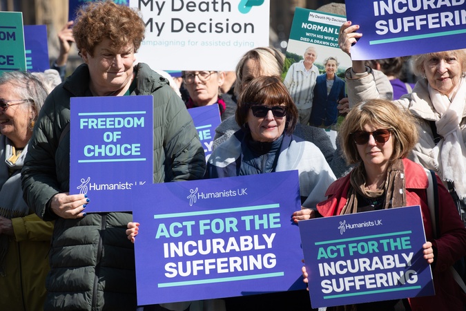 Campaigners from Pro-change campaign group Humanists UK take part in a protest calling for change to the laws regarding assisted dying at Parliament Square, London, England, UK on Monday 29 April, 2024. A debate on assisted dying is tabled in Parliament today. Currently assisted suicide is banned in England, Wales and Northern Ireland, with a maximum prison sentence of 14 years., Credit:Justin Ng / Avalon