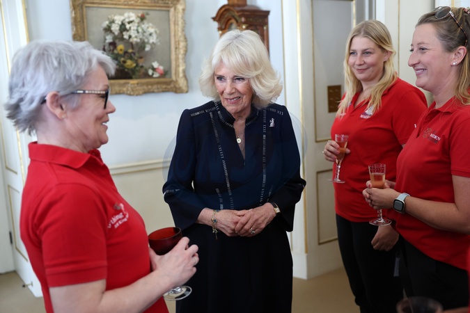 LONDON, ENGLAND - APRIL 29: Queen Camilla and Tracy Edwards MBE speaks to several members of the Maiden Yachting Crew after becoming the first ever all-female crew to win an around-the-world yacht race. Queen Camilla hosts the 'Maiden' Yachting Crew following their Global Ocean Race Win at Clarence House on April 29, 2024 in London, England., Credit:Chris Jackson / Avalon