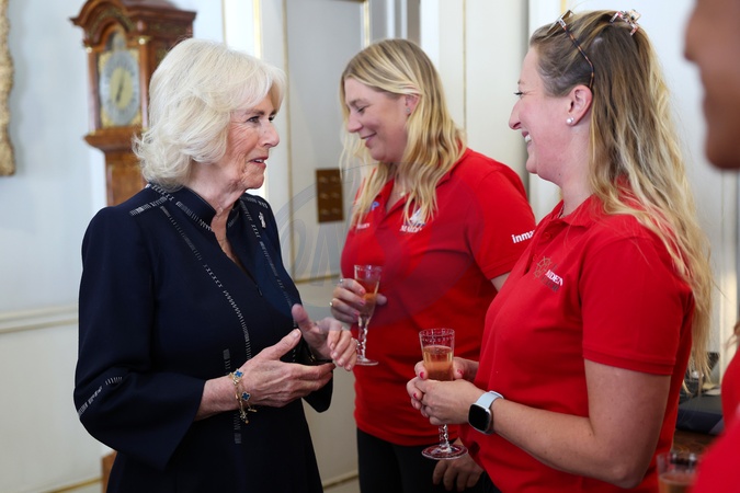 LONDON, ENGLAND - APRIL 29: Queen Camilla speaks to several members of the Maiden Yachting Crew after becoming the first ever all-female crew to win an around-the-world yacht race. Queen Camilla hosts the 'Maiden' Yachting Crew following their Global Ocean Race Win at Clarence House on April 29, 2024 in London, England., Credit:Chris Jackson / Avalon