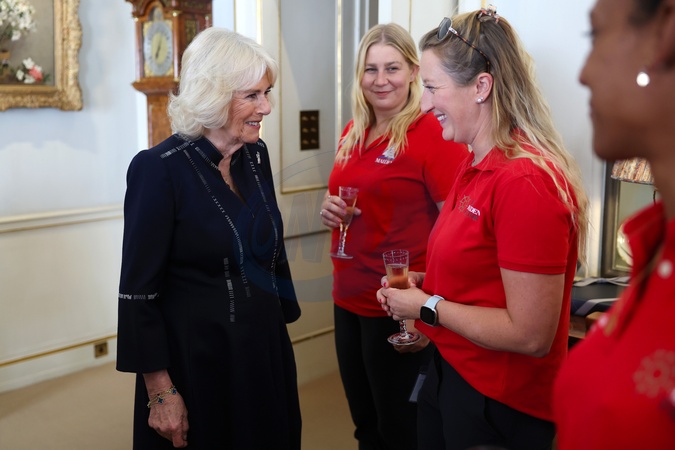 LONDON, ENGLAND - APRIL 29: Queen Camilla speaks to several members of the Maiden Yachting Crew after becoming the first ever all-female crew to win an around-the-world yacht race. Queen Camilla hosts the 'Maiden' Yachting Crew following their Global Ocean Race Win at Clarence House on April 29, 2024 in London, England., Credit:Chris Jackson / Avalon