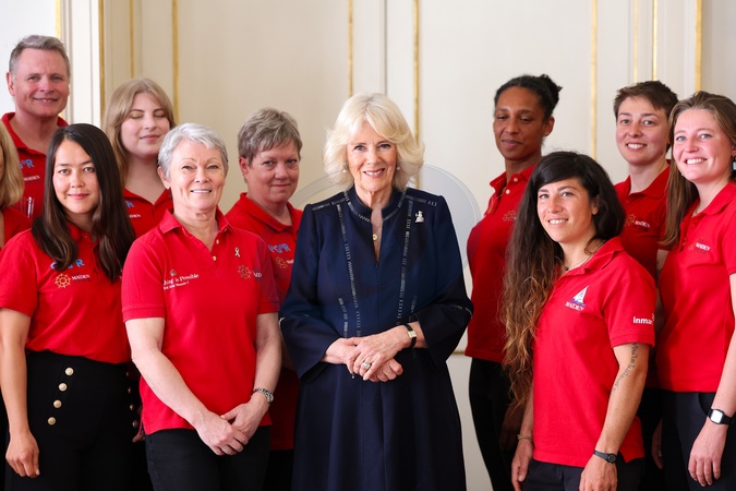 LONDON, ENGLAND - APRIL 29: Queen Camila poses for a picture with members of the Maiden Yachting Crew. Queen Camilla hosts the 'Maiden' Yachting Crew following their Global Ocean Race Win at Clarence House on April 29, 2024 in London, England., Credit:Chris Jackson / Avalon