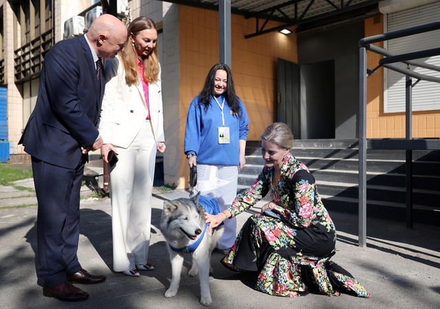 Britain's Sophie, Duchess of Edinburgh, strokes a dog as she visits the UNFPA office in Kyiv to meet with war victims on April 29, 2024. The visit, to demonstrate solidarity with the women, men and children impacted by the war, is a continuation of her work to champion survivors of conflict related sexual violence., Credit:ANATOLII STEPANOV / Avalon