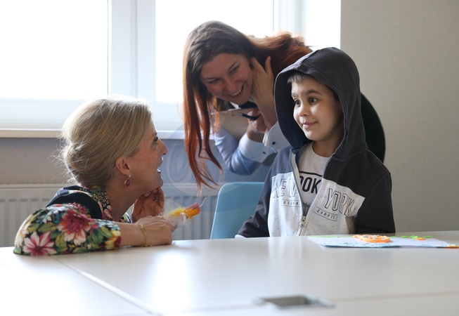 Britain's Sophie, Duchess of Edinburgh, meets with children as she visits the Family center of the NGO "Save Ukraine" in the town of Irpin on April 29, 2024 amid the Russian invasion of Ukraine. The visit, to demonstrate solidarity with the women, men and children impacted by the war, is a continuation of her work to champion survivors of conflict related sexual violence., Credit:ANATOLII STEPANOV / Avalon