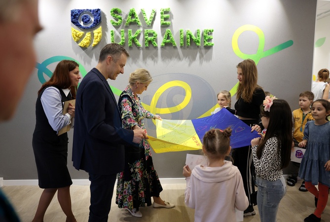 Britain's Sophie, Duchess of Edinburgh and children look at an Ukrainian flag as she visits the Family center Save Ukraine in Irpin on April 29, 2024. The visit, to demonstrate solidarity with the women, men and children impacted by the war, is a continuation of her work to champion survivors of conflict related sexual violence., Credit:ANATOLII STEPANOV / Avalon