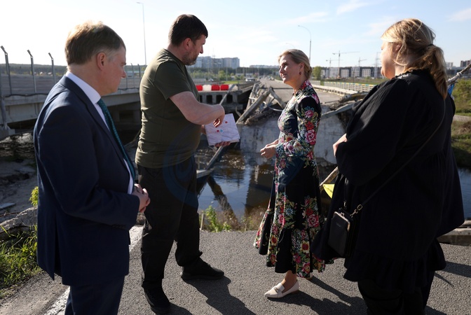 Britain's Sophie, Duchess of Edinburgh, and the Ambassador of the United Kingdom to Ukraine Martin Harris (L) visit the Romanivska Bridge in the town of Irpin on April 29, 2024 amid the Russian invasion of Ukraine. The visit, to demonstrate solidarity with the women, men and children impacted by the war, is a continuation of her work to champion survivors of conflict related sexual violence., Credit:ANATOLII STEPANOV / Avalon