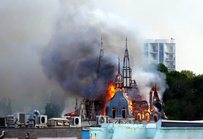 ODESA, UKRAINE - APRIL 29, 2024 - The Palace of Students of the Odesa Law Academy catches fire due to a Russian missile attack on Odesa, southern Ukraine, which killed five people. According to preliminary reports, the Russian army used a ballistic missile with a cluster munition to strike the southern Ukrainian port city., Credit:Yulii Zozulia / Avalon