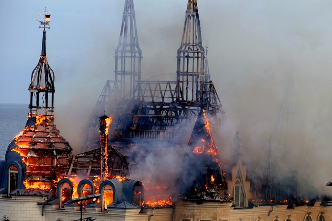 ODESA, UKRAINE - APRIL 29, 2024 - The Palace of Students of the Odesa Law Academy catches fire due to a Russian missile attack on Odesa, southern Ukraine, which killed five people. According to preliminary reports, the Russian army used a ballistic missile with a cluster munition to strike the southern Ukrainian port city., Credit:Yulii Zozulia / Avalon