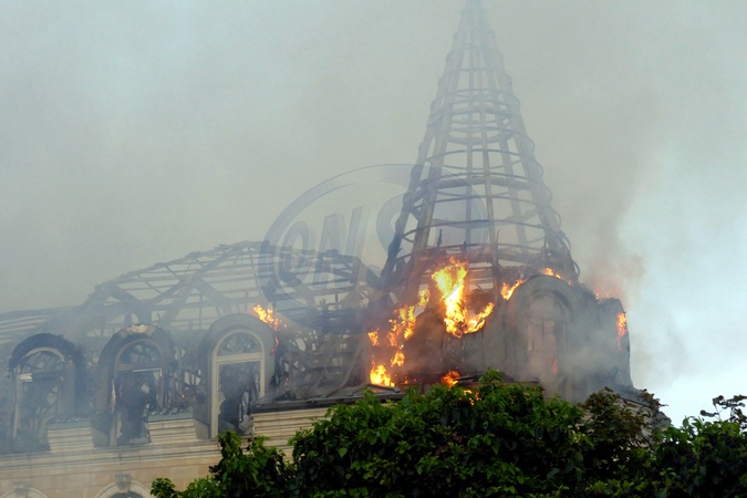 ODESA, UKRAINE - APRIL 29, 2024 - The Palace of Students of the Odesa Law Academy catches fire due to a Russian missile attack on Odesa, southern Ukraine, which killed five people. According to preliminary reports, the Russian army used a ballistic missile with a cluster munition to strike the southern Ukrainian port city., Credit:Yulii Zozulia / Avalon