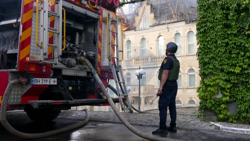 ODESA, UKRAINE - APRIL 29, 2024 - A rescuer stands by a fire engine outside the Palace of Students of the Odesa Law Academy which caught fire due to a Russian missile attack on Odesa, southern Ukraine, which killed five people. According to preliminary reports, the Russian army used a ballistic missile with a cluster munition to strike the southern Ukrainian port city., Credit:Yulii Zozulia / Avalon