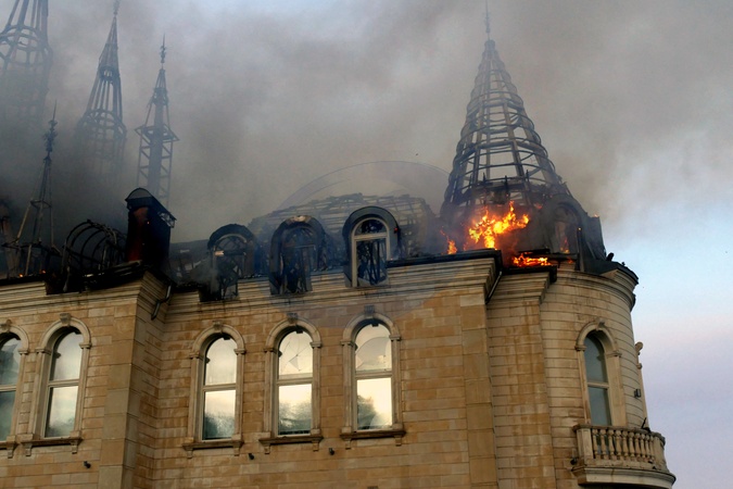 ODESA, UKRAINE - APRIL 29, 2024 - The Palace of Students of the Odesa Law Academy catches fire due to a Russian missile attack on Odesa, southern Ukraine, which killed five people. According to preliminary reports, the Russian army used a ballistic missile with a cluster munition to strike the southern Ukrainian port city., Credit:Yulii Zozulia / Avalon