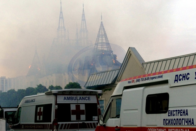 ODESA, UKRAINE - APRIL 29, 2024 - An ambulance is parked outside the Palace of Students of the Odesa Law Academy which caught fire due to a Russian missile attack on Odesa, southern Ukraine, which killed five people. According to preliminary reports, the Russian army used a ballistic missile with a cluster munition to strike the southern Ukrainian port city., Credit:Yulii Zozulia / Avalon