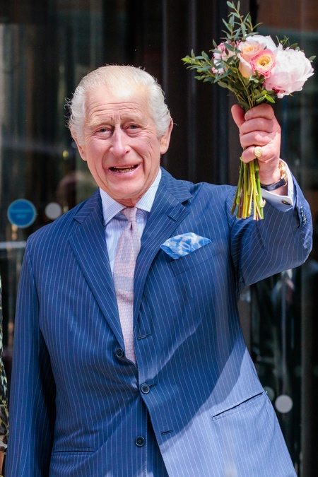 University College Hospital, London, UK. 30th April 2023.His Majesty, King Charles III, Patron of Cancer Research UK and Macmillan Cancer Support, waves a bunch of flowers following his and Queen Camilla's visit University College Hospital Macmillan Cancer Centre, marking The King's first day as the new Patron of Cancer Research UK and his first public engagement since announcing his Cancer diagnosis., Credit:Photo by Amanda Rose / Avalon