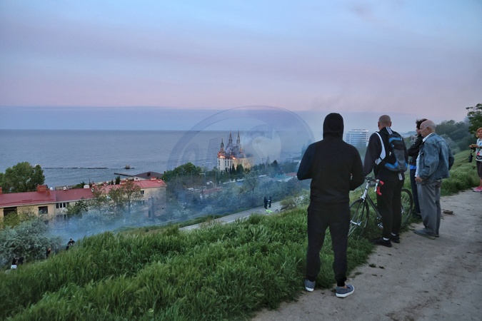 ODESA, UKRAINE - APRIL 29, 2024 - Onlookers watch the fire at the Palace of Students of the Odesa Law Academy caused by a Russian missile attack in Odesa, southern Ukraine, which has killed five people. Preliminary reports indicate that the Russian army used a ballistic missile with cluster munition to strike the southern Ukrainian port city., Credit:Nina Liashonok / Avalon