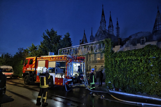ODESA, UKRAINE - APRIL 29, 2024 - Firefighters put out the fire at the Palace of Students of the Odesa Law Academy caused by a Russian missile attack in Odesa, southern Ukraine, which has killed five people. Preliminary reports indicate that the Russian army used a ballistic missile with cluster munition to strike the southern Ukrainian port city., Credit:Nina Liashonok / Avalon
