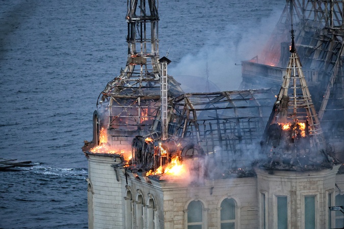 ODESA, UKRAINE - APRIL 29, 2024 - The Palace of Students of the Odesa Law Academy is on fire due to a Russian missile attack in Odesa, southern Ukraine, which has killed five people. Preliminary reports indicate that the Russian army used a ballistic missile with cluster munition to strike the southern Ukrainian port city., Credit:Nina Liashonok / Avalon