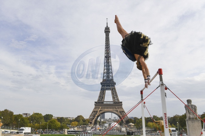 Sesja zdjęciowa z gimnastyczkami Francuskiej Federacji Gimnastycznej Mélanie de Jesus dos Santos, Marine Boyer i Lorette Charpy przebrani za Christophe'a Guillarme przed Wieżą Eiffla w Paryżu