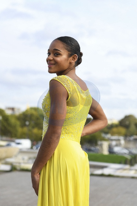 Shooting photo avec la gymnaste de la Fédération Française de Gymnastique Mélanie de Jesus dos Santos habillée en Christophe Guillarmé devant la Tour Eiffel à Paris, France, le 23 avril 2024. © Christophe Guillarmé via Bestimage