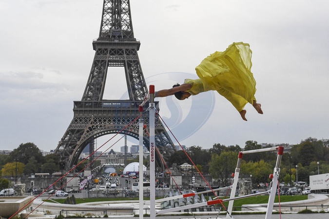 Shooting photo avec la gymnaste de la Fédération Française de Gymnastique Mélanie de Jesus dos Santos habillée en Christophe Guillarmé devant la Tour Eiffel à Paris, France, le 23 avril 2024. © Christophe Guillarmé via Bestimage