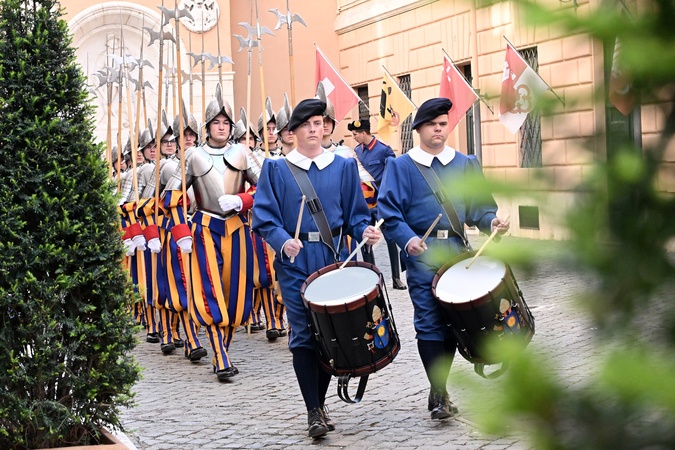 Rekruci Papieskiej Gwardii Szwajcarskiej przygotowują się do przysięgi. Watykan, 30 kwietnia 2024 r