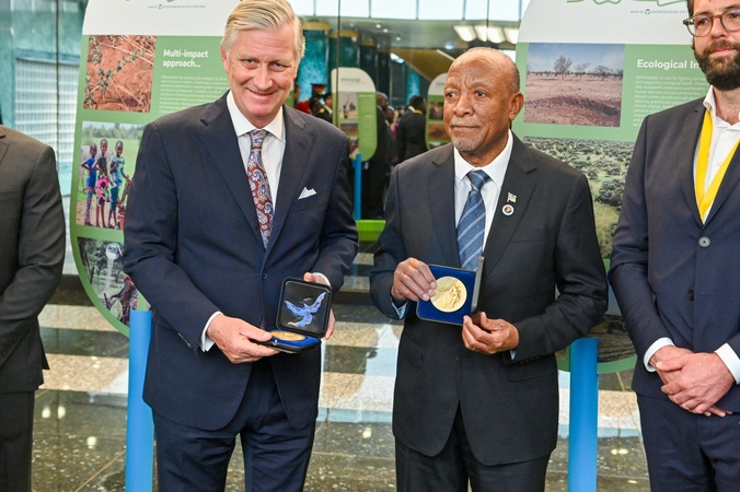 Le roi Philippe de Belgique en visite à l'exposition "Lignaverda" à Windhoek lors de son voyage de travail en Namibie. Le 30 avril 2024 Namibia, Windhoek, 30 april 2024 Majesty King Philippe official working travel in Namibia. King Philippe of Belgium during Official welcoming by HE Dr Nangolo Mbumba, President of the Republic of Namibia Tête-à-tête meeting between HM the King and HE the President HM the King and HE the President – visit of the photo exhibition Lignaverda (Reforestation Cooperation) Welcome cerremony Belgian National Anthem,concurrently with 21 Gun Salute Inspection of the Guard of Honour Namibian National and African Union Anthems. March Past Presentation line: H.E. the President presents his Cabinet Ministers and the Chief of Protocol presents Members of the Diplomatic Corps -HM the King presents members of his delegation to H.E. the President - Cultural Performance